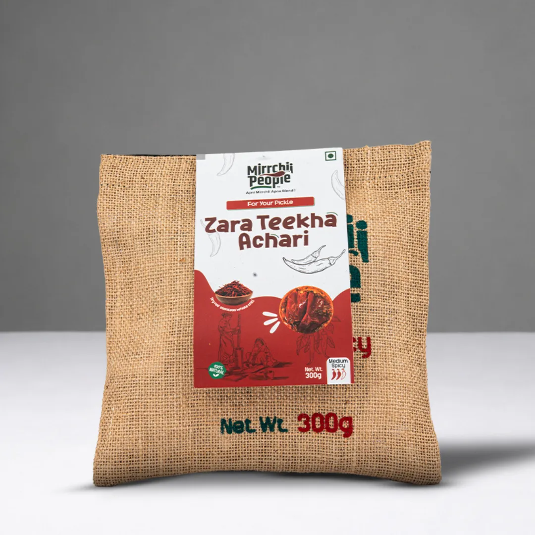 Zara Teekha Achari is specially crafted for those who prefer a medium-spicy, well-balanced flavour. Made from naturally sun-dried whole stemless red chillies, it delivers a warm, smooth heat with rich colour and authentic achari aroma. It enhances your pickles without overpowering them, making it ideal for families who enjoy moderate spice with full flavour.